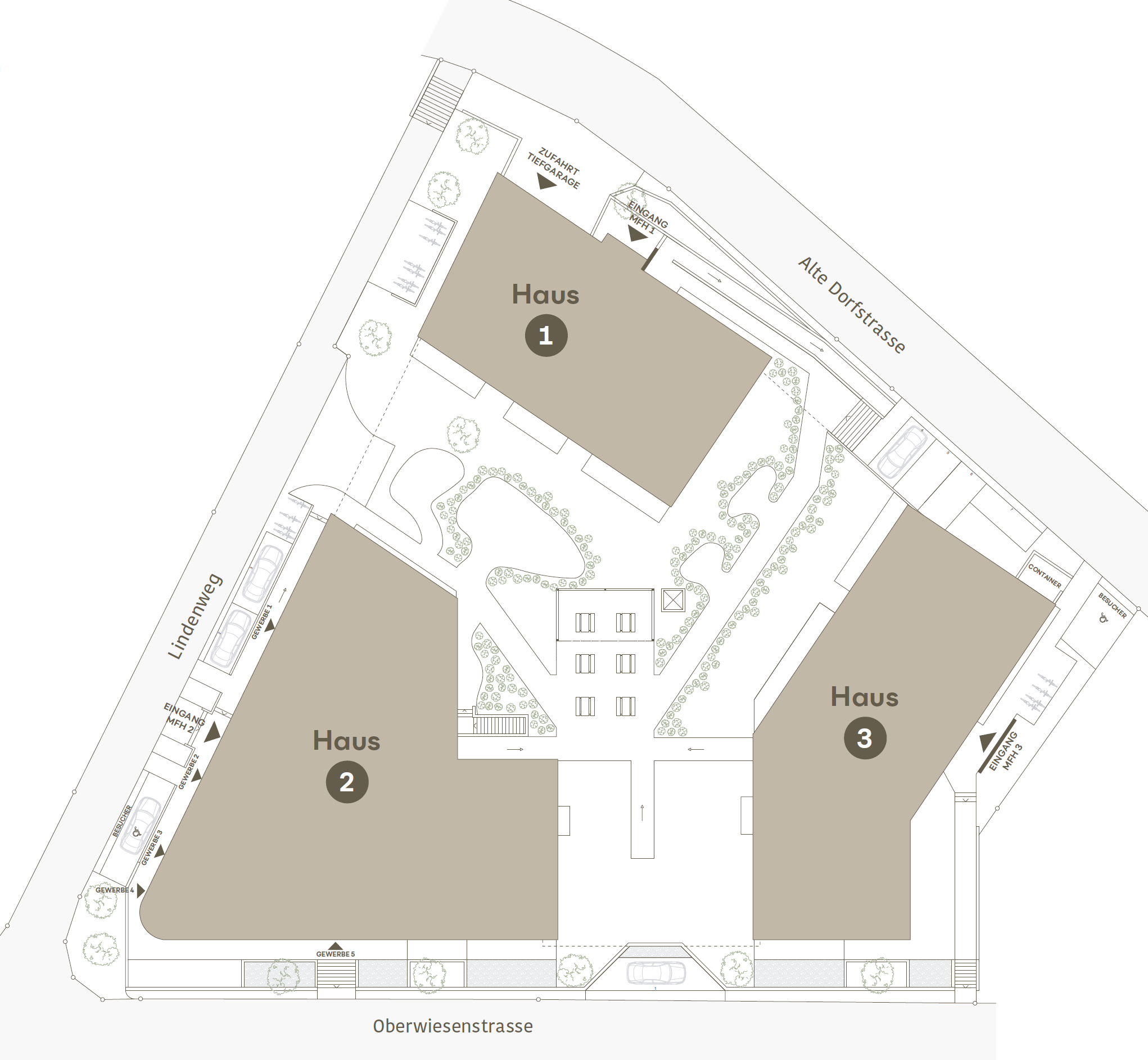 Die Aussenbereiche bieten eine ausgewogene Mischung aus Privatsphäre und Gemeinschaft. Neben geschützten, privaten Rückzugsorten stehen grosszügige Gemeinschaftsflächen mit Grünanlagen, einem Pavillon für gesellige Treffen und einem kinderfreundlichen Spielbereich zur Verfügung.